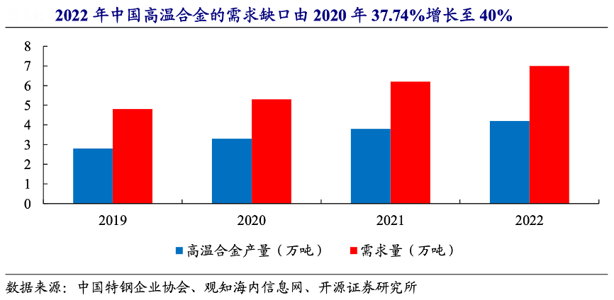 經典案例:根據中國特鋼企業協會、觀知海內信息網、開源證券研究所等綜合資訊表明,我國高溫合金行業從業企業數量較少,整體產能、產量較小,長期依賴進口且 處于供不應求狀態,盡管過去十年高溫合金的供應量實現了大幅增長,但供需差距依舊在持續擴大。2022 年中國高溫合金的需求缺口由 2020 年 37.74%增長至 40%。減少對進口的依賴并加快國產替代,成為國內高溫合金行業面臨的主要挑戰之一。