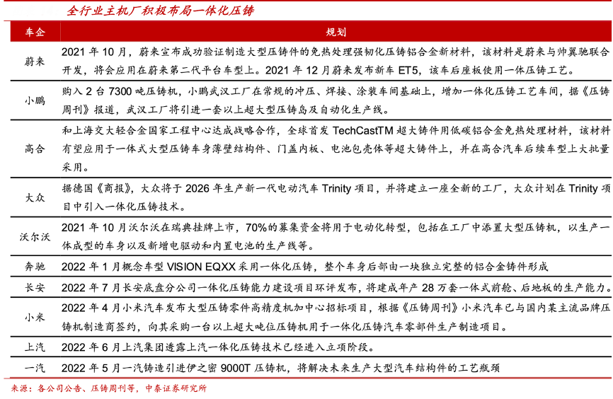 經(jīng)典案例:根據(jù)各公司公告、壓鑄周刊、中泰證券研究所等綜合資訊表明,車身工藝革命方興未艾,一體化壓鑄是效率、降本、輕量化的最優(yōu)工藝,2020年特斯拉 率先在 model Y 上量產(chǎn),自 2021 年起蔚來、理想、小鵬、華為問界等國內(nèi)新勢力搶先布局,奔馳、福特、大眾、沃爾沃、長安、一汽等國內(nèi)外傳統(tǒng)主機(jī)廠也加緊規(guī)劃,行業(yè)趨勢明確。