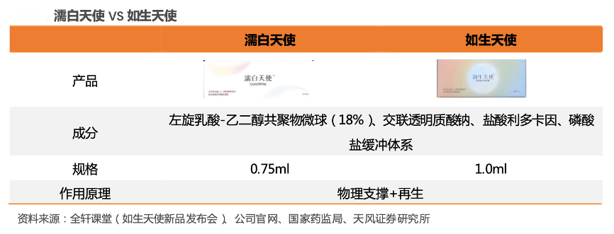 經典案例:根據全軒課堂(如生天使新品發布會)、公司官網、國家藥監局、天風證券研究所等綜合資訊表明,愛美客公司于 2021 年推出濡白天使, 與伊妍仕、艾維嵐兩款產品一同拉開國內再生序幕,23 年 7 月再推如生天使,與濡白天使 共同開啟再生系列化篇章。