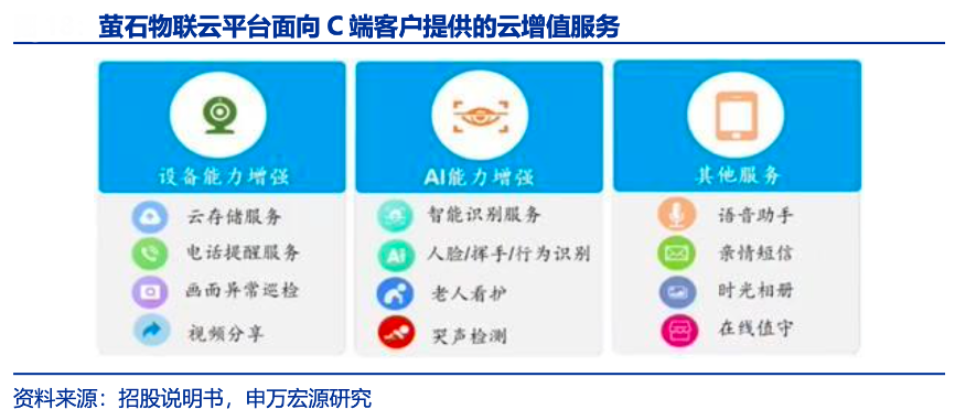 經(jīng)典案例:根據(jù)招股說明書、申萬宏源研究等綜合資訊表明,螢石基于強(qiáng)大的云平臺能力,形成“優(yōu)質(zhì)產(chǎn)品引流——積累用戶基數(shù)——增值服務(wù)帶來高毛利”的商業(yè)模式,構(gòu)成正反饋循環(huán)。對比其他競爭對手,形成價值周期更長的盈利模式;以視覺能力為特色,滿足用戶多元化需求,具備獨(dú)特優(yōu)勢。