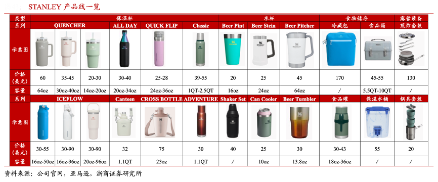 經典案例:根據公司官網、亞馬遜、浙商證券研究所等綜合資訊表明,STANLEY公司產品線:核心保溫杯系列主要分為 Quencher,Iceflow,Classic,Adventure, Cross Bottle,All Day Slim Bottle 等,主銷款為 Quencher 和 Iceflow,目前在美國亞馬遜銷 量貢獻占公司整體約 60%/15%。整體設計改變過去簡約形象,以更受女性喜歡的高色覺沖 擊力的色調為主。
