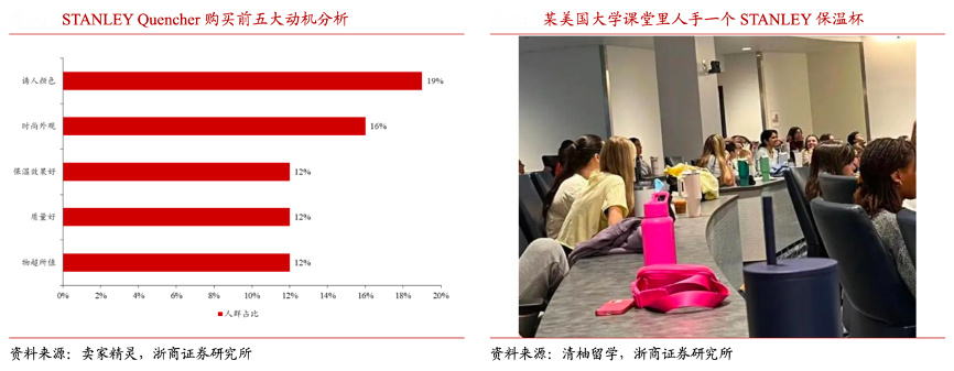 經典案例:根據賣家精靈、清柚留學、浙商證券研究所等綜合資訊表明,STANLEY 的消費者主要集中在 25-45 歲女 性,復購率較高,其STANLEY Quencher 系列購買前兩大動機為誘人色彩(調研消 費者中占 19%),時尚外觀(占 16%),類似設計成功率在 Crocs 洞洞鞋、lululemon 瑜伽褲、施華洛世奇多巴胺手鏈等均可得到驗證。
