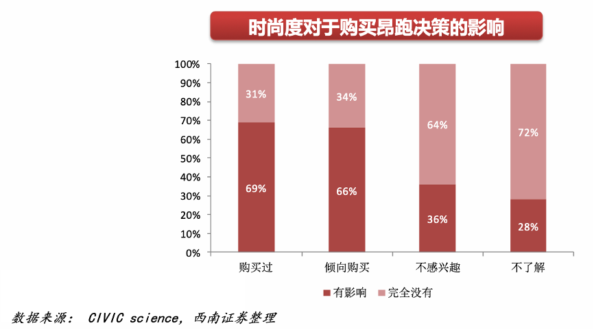 經典案例:根據CIVIC science、西南證券等綜合資訊表明,昂跑以時尚引領購買潮,七成消費者視鞋履時尚性為關鍵決策因素,據三方數據統計,在選擇是否購買昂跑鞋時,有約70%的已購買者表示昂跑的時尚度對于他們的購買決策產生了影響,傾向購買的潛在消費者中也有66%的比例在購買時會考慮時尚屬性的影響。