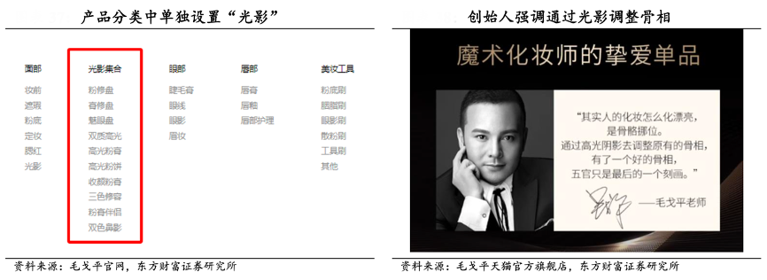 經典案例:根據毛戈平官網、毛戈平天貓官方旗艦店、東方財富證券研究所等綜合資訊表明,毛戈平先生從中國傳統水墨、西方素描等藝術領域中汲取靈感,憑借自身幾十年的化妝經驗,糅以不同領域的化妝手法形成獨特的光影化妝手法和光影美學體系,通過色彩的冷暖、明暗的修飾形成視覺上的進與退,收與放進而完成光影塑型,重塑臉部輪廓與肌膚質感打造精致微雕臉龐,盡現東方女性的獨特魅力。
