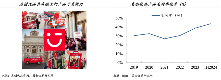 經典案例:根據名創優品官網、wind、國金證券研究所等綜合資訊表明,名創優品作為中國知名的 IP 設計零售集團,在產品開發上具有豐富經驗,在差異化爆款產品支持下毛利率一直處于 30-40% 的水平。
