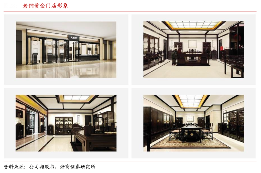 經典案例:根據公司招股書、浙商證券研究所等綜合資訊表明,老鋪黃金所有門店均為自營,其中直營 門店 22 家,聯營門店 11 家,能夠嚴格控制服務質量,建立和維護良好的品牌形象。在門 店體驗方面,老鋪黃金通過書房主體場景提供沉浸式的消費體驗,所有門店統一裝修風格,呈現出中國傳統文化的意境。