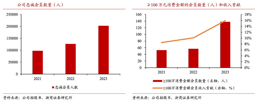 經典案例:根據公司招股書、浙商證券研究所等綜合資訊表明,通過精準把握目標客戶消費需求和優質的客戶服務,2023年老鋪黃金忠誠會員人數增長 60%。收入貢獻在 100 萬元以上的會員收入占比從 2021 年的 8.5%提升至 2023 年的 15.9%,體現高凈值客戶的品牌認可度。