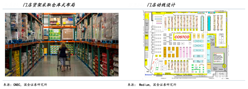 經典案例:根據CNBC、Medium、國金證券研究所等綜合資訊表明,Costco公司深知消費者來購物的首要原因在于更優質實惠的商品,即被“極致性價比”所吸引, 因此在門店設計上能簡則簡、一切以效率為先。例如公司采取大包裝商品便于批量售賣、 倉庫式貨架減少上貨的人力和時間成本,將節約下來的運營成本通過低毛利回饋給會員從 而鞏固自身的競爭優勢。