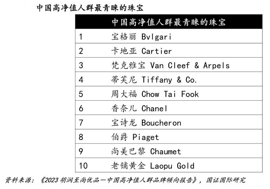 經(jīng)典案例:根據(jù)《2023胡潤至尚優(yōu)品—中國高凈值人群品牌傾向報(bào)告》、國證國際研究等綜合資訊表明,老鋪黃金公司品牌定位高端,根據(jù)胡潤研究院于 2023 年 3 月發(fā)布的《2023 胡潤至尚優(yōu)品-中國高凈值人群品牌傾向報(bào)告》,老鋪黃金品牌與眾多一線珠寶品牌一同上榜高凈值人群最青睞的十大珠寶品牌,是僅有的兩家中國珠寶品牌之一。