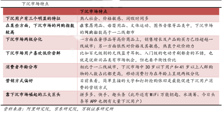緊扣“下沉市場”主流消費人群“高性價比型”消費特點,強化生活必需品類的銷售,提升人群的品牌認同感,推進區域內的賣場、超市、母嬰店、特殊渠道等精細化渠道分銷,驅動終端動銷及“個人代理發展”,放大區域內渠道分銷及意見領袖價值。根據阿里研究院、京東研究院及萬聯證券研究所等綜合資訊表明,下沉市場30歲以下用戶和41歲以上的購物人群比較多,對價格比較敏感,在一些產品如母嬰用品、家居用品等網購指數較高。已有拼多多、趣頭條、快手等APP依靠下 沉市場迅速崛起。