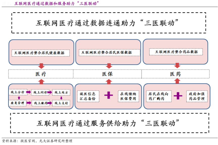 互聯(lián)網(wǎng)醫(yī)療涉及到醫(yī)療、醫(yī)保、醫(yī)藥等多個(gè)醫(yī)療環(huán)節(jié),需要以數(shù)字化技術(shù)作為重要系統(tǒng)支撐,互聯(lián)網(wǎng)醫(yī)療通過數(shù)據(jù)和服務(wù)助力“三醫(yī)聯(lián)動(dòng)”,醫(yī)療數(shù)據(jù)和醫(yī)療服務(wù)成為互聯(lián)網(wǎng)醫(yī)療發(fā)展的兩大核心環(huán)節(jié)。據(jù)微醫(yī)官網(wǎng)、光大證券研究所等綜合資訊表明,互聯(lián)網(wǎng)醫(yī)療的快速發(fā)展,需要借助醫(yī)療服務(wù)強(qiáng)化醫(yī)生患者在線溝通、在線診斷建議及線上處方開具等,以服務(wù)聚合醫(yī)療消費(fèi);同時(shí)大量醫(yī)療服務(wù)需要強(qiáng)化醫(yī)保支付、信息匯總,更需要強(qiáng)化醫(yī)藥數(shù)據(jù)同步、藥品管理等,強(qiáng)大且專業(yè)的醫(yī)療數(shù)據(jù)使醫(yī)療服務(wù)更具成效、更具價(jià)值。