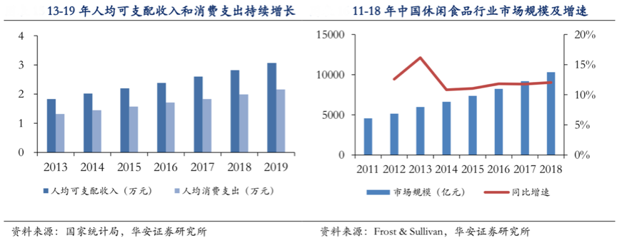 經典案例:根據國家統計局、華安證券研究所等綜合數據顯示,2013-2019年我國人均可支配收和消費支出持續增長,同時根據Frpst&Sullivan、華安證券研究所等綜合資訊表示,2011年-2018年中國休閑食品行業市場規模持續擴大,品類極具增長空間。