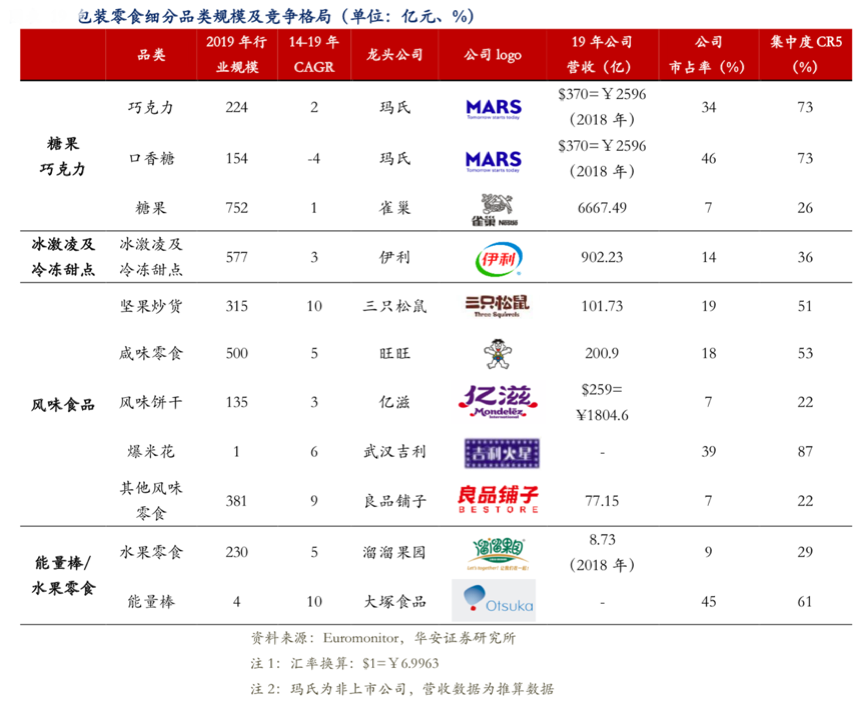 經典案例:根據Euromonitor、華安證券研究所等綜合資訊表明,包裝零食細分品類規模比較大,且每一個小品類里都已涌現出了一些細分龍頭,如巧克力龍頭瑪氏,堅果炒貨龍頭三只松鼠,但還未出現統領全行業的龍頭公司。2019 年我國休 閑食品行業 CR5 僅為 16.3%,而全球休閑食品行業 CR5 為 25.6%,我國休閑食品品類極具成長空間。