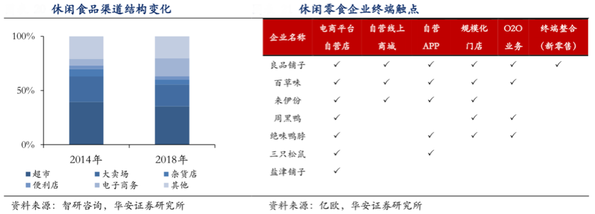 經典案例:根據智研咨詢、華安證券研究所等綜合資訊表明,2014年-2018年休閑食品渠道結構中超市占比從39%降為 35%,電子商務占比從 6%增長至 17%,消費者忠誠度較低、渠道選擇分散。同時根據億歐、華安證券研究所等綜合資訊表是,休閑零食企業的終端觸點更加多元化,良品鋪子在電商平臺、自營 線上商城、規?;T店等各方面都有布局,三只松鼠主要集中于電商平臺自營店和自營 APP。