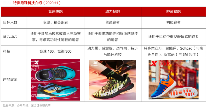 經(jīng)典案例:根據(jù)公司年報、東方證券研究所等綜合資訊表明,特步推出競速快跑、動力長跑和舒適易跑三個核心跑鞋系列,融合不同科技,推出多個核心科技平臺以應(yīng)對跑者遇到的不同天氣和運動狀態(tài)。