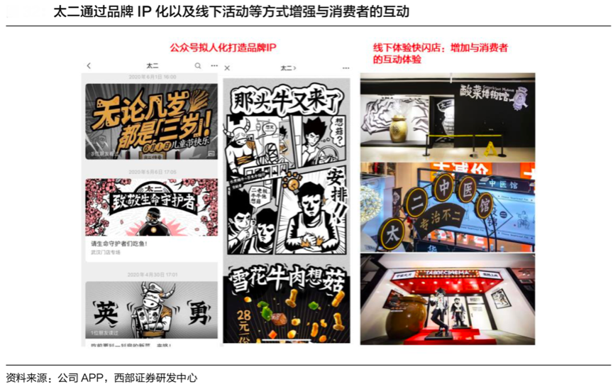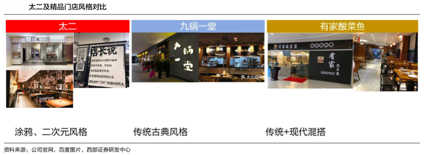 經(jīng)典案例:根據(jù)公司官網(wǎng)、百度圖片和西部證券研發(fā)中心等綜合資訊表明,太二品牌緊抓年輕消費(fèi)群體,定位最為清晰,比如品牌 IP 化、極簡主義等,對年輕群體具有較大吸引力;此外,在食材口味方面,太二對于配料,比如酸菜、米飯也是精挑細(xì)選,差異化的賣點(diǎn)延續(xù)了其個性化的風(fēng)格。
