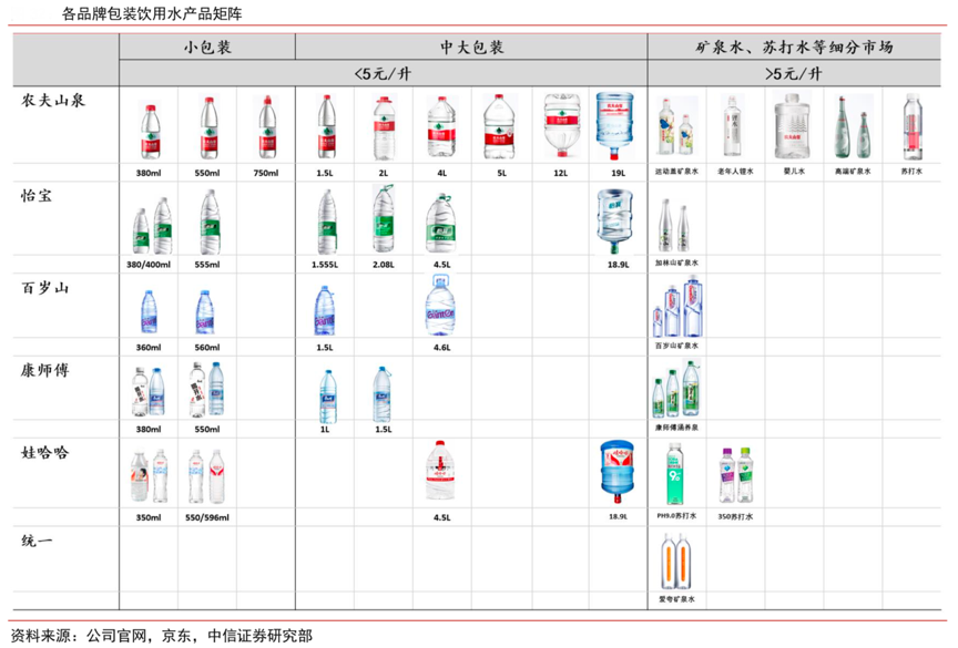 經典案例:根據公司官網、京東及中信證券研究部等綜合資訊表明,農夫山泉在包裝飲用水布局上兼具廣度和深度,一方面在包裝規模的設計上SKU最寬、最密,覆蓋各個消費場景;另一方面推出差異化產品(嬰兒水和鋰水)和高端化產品(天然礦泉水的運動蓋裝和玻璃瓶)。