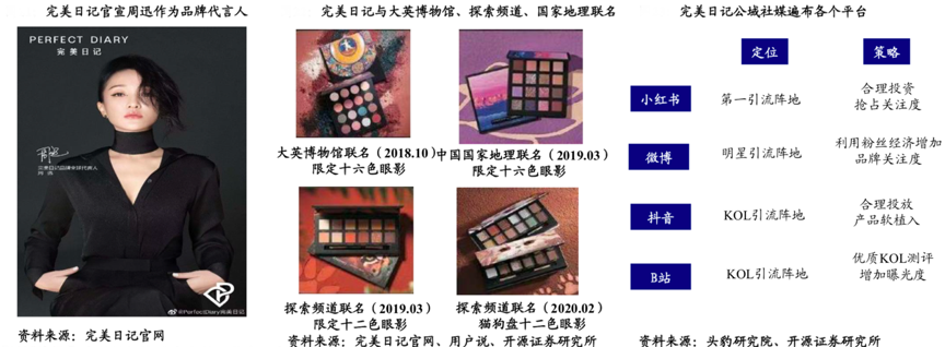 經典案例:根據完美日記網官網、用戶說、頭豹研究院及開源證券研究所等綜合資訊表明,完美日記的用戶經營極具看點,其于2020年10月官宣周迅作為品牌全球代言人,聯合李佳琦進行傳播,并先后與大英博物館、Discovery探索頻道、中國國家地理、紐約大都會藝術博物館聯名,社媒渠道遍布小紅書、微博、抖音、B站等各個平臺,截至2020年11月,完美日記的小紅書品牌賬號已擁有194.9萬粉絲,遠超其他知名國貨、外資彩妝品牌。