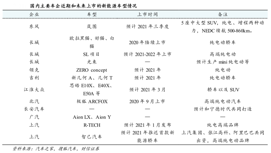 經典案例:根據汽車之家、搜狐汽車和財信證券等綜合資訊表明,國內優質新能源車型不斷上市,滿足消費者多層次的需求。2020 年下半年以來國內上市車型有比亞迪漢 EV、歐拉好貓、蔚來 EC6、廣汽新能源 Aion V 等,展望2021年仍有東風嵐圖、上汽智己、新幾何 A、大眾 ID4 等新車型,優質供給的增加可以豐富產品線,滿足不同的消費者需求。