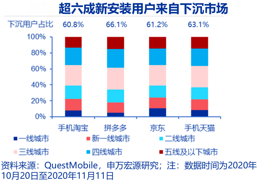 經(jīng)典案例:根據(jù)QuestMobile、申萬宏源研究等綜合資訊表明,拼多多用戶增長接近天花板,通過搶占“日常高頻消費場景”激活下沉市場用戶。20Q3拼多多年度活躍用戶數(shù)超7億,同比增速低于10%,流量紅利見頂。2019年生鮮品類電商滲透率僅7.6%,社區(qū)團購將高頻剛需、高性價比生鮮產(chǎn)品線上化,進一步釋放下沉市場“網(wǎng)上消費潛力”。