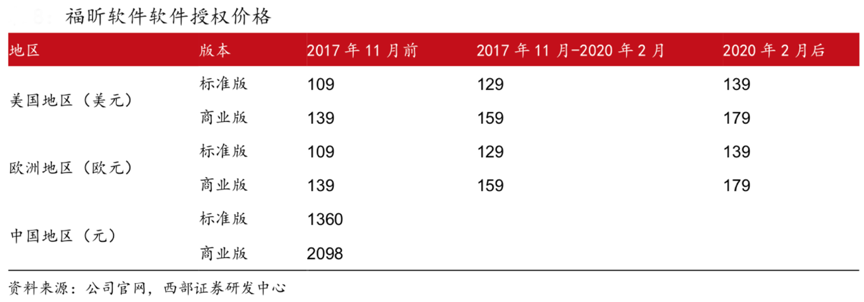 經典案例:根據公司官網、西部證券研究中心等綜合資訊表明,銷售模式方面,福昕軟件公司提供靈活的銷售模式,用戶可以選擇授權或期間訂閱模式,也提供靈活授權模式,永久授權模式下,公司 Phantom PDF 10 標準版本海外市場定價在 139 美元/歐元,國內市場為 1360 元,與海外同類產品價格水平相近(Adobe 目前已無授權價格可查,Nitro Pro 基礎版的標準售價為 159 美元)。