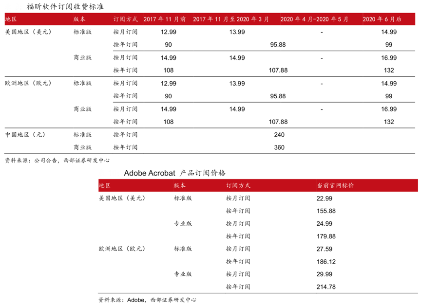 經典案例:根據公司官網、Adobe、西部證券研究中心等綜合資訊表明,福昕軟件公司 Phantom PDF 10 訂閱服務按年訂閱模式下,海外主要市場全年費用標價約 132 美元或歐元,相比 Adobe 同類型產品 Acrobat DC 的定價低約 26-46%,在功能性能基本 相當的前提下,其產品服務具有更高的性價比。