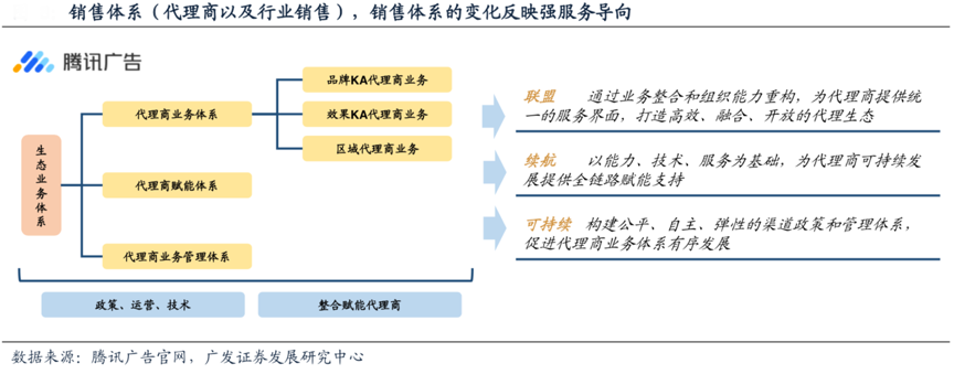 經(jīng)典案例:根據(jù)騰訊廣告官網(wǎng)、廣發(fā)證券發(fā)展研究中心等綜合資訊表明,組織架構(gòu)的調(diào)整打通了商業(yè)化鏈接空間,為騰訊廣告商業(yè)化路徑提供底層框架支撐。“930”改革之后,騰訊體系的資源不斷整合優(yōu)化,騰訊廣告銷售團(tuán)隊(duì)以及生態(tài)服務(wù) 商體系也在不斷升級(jí),同時(shí)技術(shù)和平臺(tái)也在不斷升級(jí)。
