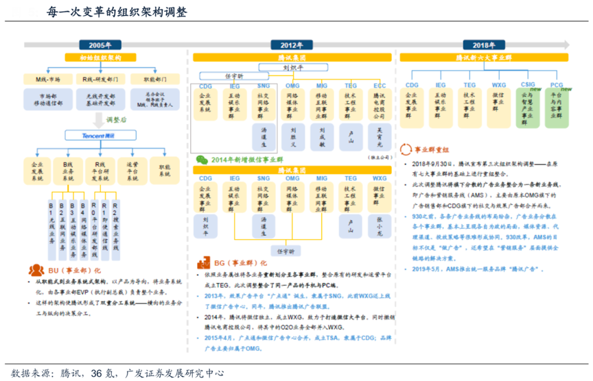 經(jīng)典案例:根據(jù)騰訊、36氪、廣發(fā)證券發(fā)展研究中心等綜合資訊表明,2018年的“930改革”,是騰訊從消費(fèi)互聯(lián)網(wǎng)向產(chǎn)業(yè)互聯(lián)網(wǎng)升級(jí)的一次變革,不僅事業(yè)群進(jìn)行了較大調(diào)整,還專門整合了AMS事業(yè)線。AMS事業(yè)線由原本網(wǎng)絡(luò)媒體事 業(yè)群(OMG)旗下的廣告銷售部和企業(yè)與發(fā)展事業(yè)群(CDG)旗下的社交與效果廣 告部合并而來(lái),自此騰訊廣告業(yè)務(wù)在媒體資源、投放數(shù)據(jù)、銷售及渠道系統(tǒng)上逐漸開(kāi)始實(shí)現(xiàn)整合以及協(xié)同。