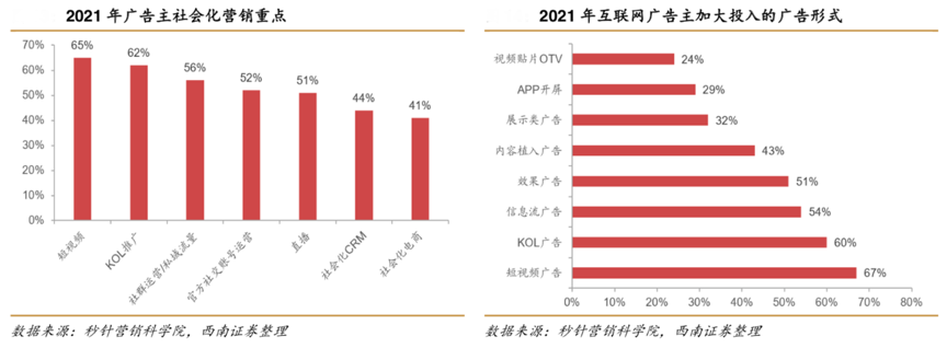 經(jīng)典案例:根據(jù)秒針營(yíng)銷科學(xué)院、西南證券等綜合資訊表明,2021年,在社會(huì)化營(yíng)銷方式選擇意向調(diào)查中,KOL 推廣以 62.0%的占比位列第二,僅次于短視頻,成為廣告 主社會(huì)化營(yíng)銷重點(diǎn)之一。同時(shí),互聯(lián)網(wǎng)廣告主加大投入的廣告形式里 KOL 廣告占比 60.0%, 位列第二,同樣僅次于短視頻廣告。可以看出,在短視頻營(yíng)銷之后,KOL 營(yíng)銷成為整個(gè)互聯(lián) 網(wǎng)營(yíng)銷業(yè)界關(guān)注的新重心,逐漸搶奪話語(yǔ)權(quán)。