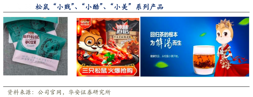 經典案例:根據公司官網、華安證券研究所等綜合資訊表明,三只松鼠以堅果起家,松鼠形象和堅果品類高度契合,代表著不同系列產品,“小酷”——干果類產品,“小賤”——休閑 零食類產品,“小美”——花果類產品。其以動畫為支點,持續性的內容輸出幫助建立縱深的產品線。