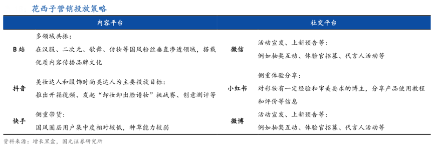 經(jīng)典案例:從增長(zhǎng)黑盒、國(guó)元證券研究所等綜合資訊表明,花西子根據(jù)不同平臺(tái)特色,匹配適合的營(yíng)銷投放策略。例如,B 站中品牌首先針對(duì)核心國(guó)風(fēng)垂直圈層精 準(zhǔn)投放二次元、仿妝、華服展示等,然后逐漸從國(guó)粉圈向外破圈傳播;抖音方面,花西子一方面投放開屏廣告塑造品牌形象,另一方面主要投放美妝和服飾時(shí)尚垂類達(dá)人,并推出開箱視頻、發(fā)起“卸妝卸出臉譜妝”挑戰(zhàn)賽等,多維度進(jìn)行種草。