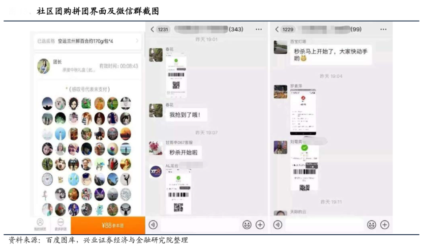 經(jīng)典案例:根據(jù)百度圖庫(kù)、興業(yè)證券經(jīng)濟(jì)與金融研究院等綜合資訊表明,社區(qū)團(tuán)購(gòu)的日常推廣場(chǎng)景發(fā)生在社群內(nèi),本質(zhì)上是一種社區(qū)拼團(tuán)購(gòu)物方式,在群內(nèi)推廣和其他消費(fèi)者、甚至是社區(qū)內(nèi)熟人朋友購(gòu)物的氛圍下,對(duì)于天生熱愛購(gòu)物的人群而言,較易產(chǎn)生跟風(fēng)購(gòu)物的現(xiàn)象。