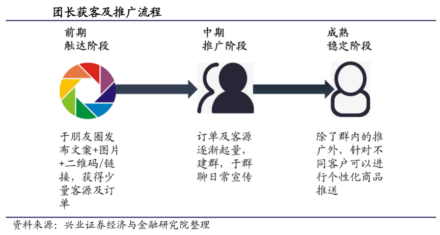 經(jīng)典案例:根據(jù)興業(yè)證券經(jīng)濟(jì)與金融研究院等綜合資訊表明,對(duì)于居住在社區(qū)附近的業(yè)主或者租戶而言,通過熟人網(wǎng)絡(luò)購(gòu)買、同社區(qū)用戶的相互介紹等,加上群里面團(tuán)長(zhǎng)的互動(dòng),加入了更加可靠的社交元素,整體上用戶交互體驗(yàn)更好,信任感更強(qiáng),同時(shí)經(jīng)由社交軟件擴(kuò)散的途徑能夠廣泛觸達(dá)社區(qū)居民。