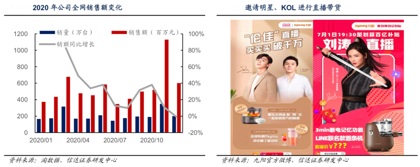 經典案例:根據淘數據、九陽官方微博、信達證券研發中心等綜合資訊表明,隨著社交電商、直播帶貨的興起,九陽公司邀請品牌代言人鄧倫、著名帶貨主播李佳琦、劉濤等為品牌宣傳直播帶貨。2020年疫情期間,其通過天貓旗艦店以直播的方式向消費者介紹、展示產品,解答消費者疑惑,并且其為經銷商和導購員提供直播硬件設備和直播營銷技巧培訓,2020年上半年線下渠道直播近 20 萬 場次,3月份公司銷售額同比增長 82.71%。