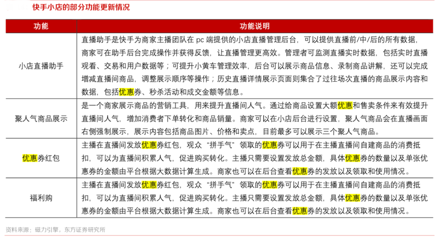 經(jīng)典案例:根據(jù)磁力引擎、東方證券研究所等綜合資訊表明,快手小店 2020 年以來(lái),迎來(lái)了密集的功能完善,新增了很多數(shù)據(jù)回傳和管理工具、流量獲取工具、商品管理和上架工具等。