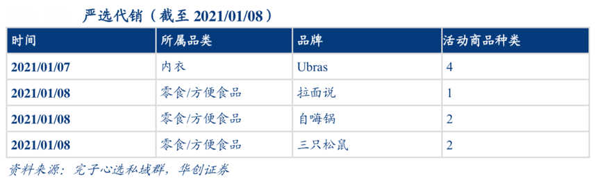 經典案例:根據完子心選私域群、華創證券等綜合資訊表明,完子之家私域發展“嚴選代銷”模式。逸仙電商通過自行選品(類似網易嚴選),在私域渠道內經銷非競爭品牌(異業合作),主要品類集中于零食/方便食品、女性內衣等。商 品售賣采用限時活動促銷的方式,在售賣日前 3 天左右開始預熱,且活動時間短至 1 天, 短時效性+頻繁推送優惠信息刺激用戶下單購買。