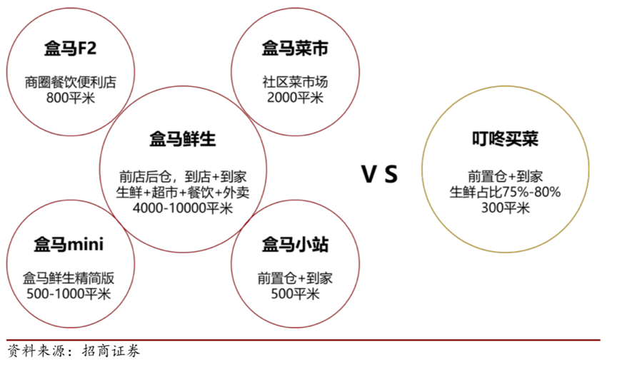 經典案例:根據招商證券等綜合資訊顯示,國內知名的生鮮新零售標桿品牌,盒馬鮮生,其已經創造出盒馬菜市、盒馬鮮生、盒馬mini、盒馬小站等多種生態業態,涵蓋菜市場、餐飲便利店、前置倉+到家等多種生鮮新零售模式,新零售平臺建設前景可期,與叮咚買菜等形成鮮明區隔,引領行業風潮。