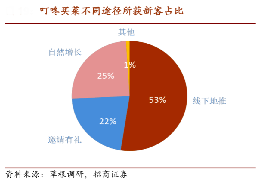 經典案例:根據草根調研、招商證券等綜合資訊顯示,叮咚買菜獲客途徑以線下地推為主,通過線下地推所獲新客占比過半,通過邀請有禮所獲新客與自然增長各占約 1/4。叮咚買菜把線下地推作為進入新城市的冷啟動方式,獲取第一批穩定的種子用戶后,再通過線上老用戶拉新用戶進一步獲取新客。