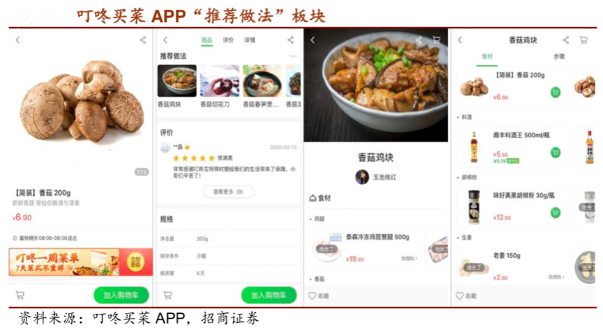 經典案例:根據叮咚買菜APP、招商證券等的資訊顯示,叮咚買菜 APP用戶點擊每一個單品,商品詳情的下方都會顯示“推薦做法”, 同時給出對應食材和調料的購買鏈接,方便用戶一站式購齊菜譜食材,進而提高客單價。