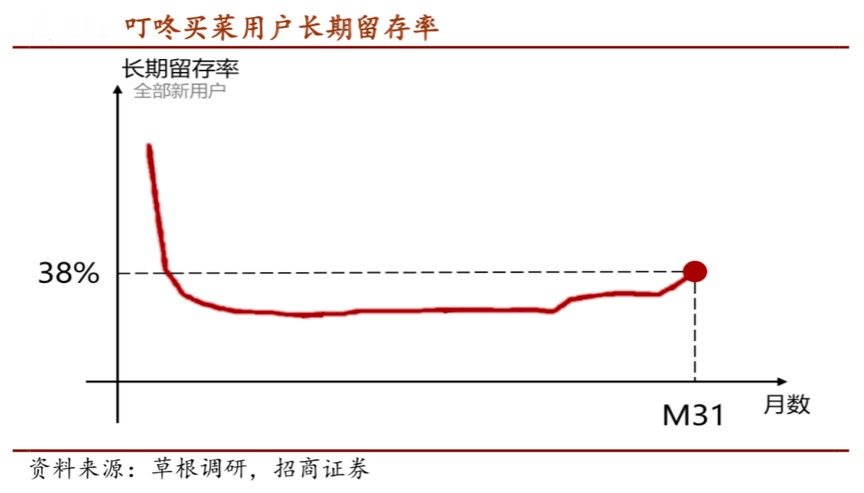 經典案例:根據草根調研、招商證券等的資訊顯示,叮咚買菜第31個月長期留存率翹尾到 38%,老用戶月均消費 6.5 次,處于行業領先地位。