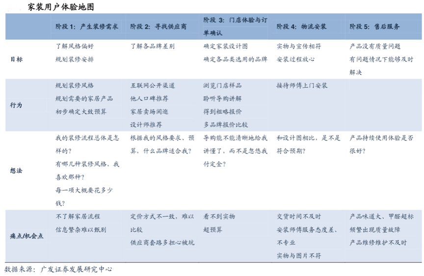 以家裝家居行業為例,據廣發證券發展研究中心等綜合資訊顯示,“家裝用戶體驗”鏈條長、涉及環節多,同時用戶的家裝消費痛點集中在三個方面:1)不清楚裝修的核心需求及實現方式,單純靠用戶只能表達裝修的結果及想展現的家居生活,具體怎樣選擇風格、規劃裝修及配備怎樣的建材產品、家具等家居消費者并不很清楚;2)終端門店同質化體驗突出,需要走多家門店、權衡多家品牌才能真正實現自己的裝修方案;3)希望服務商、品牌商對家裝過程進行適度跟進及有效反饋,而不是一賣了之。