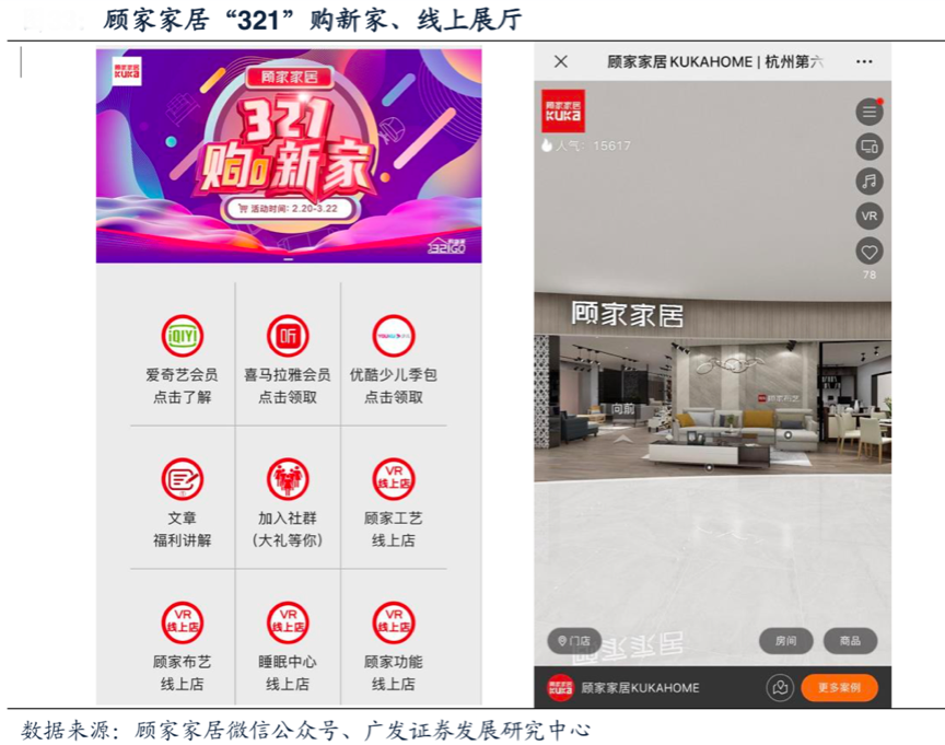 經典案例:據顧家家居微信公眾號、廣發證券發展研究中心等綜合資訊表明,顧家以“321”全國互動購物節吸引粉絲互動,與愛奇世會員體系、喜馬拉雅、優酷等公司會員體系積極嫁接,強化會員社群、線上店等的功能,以線上VR展廳生動化展示公司產品,并強化用戶的線上家居消費體驗,亮化家居新零售平臺策劃運營。