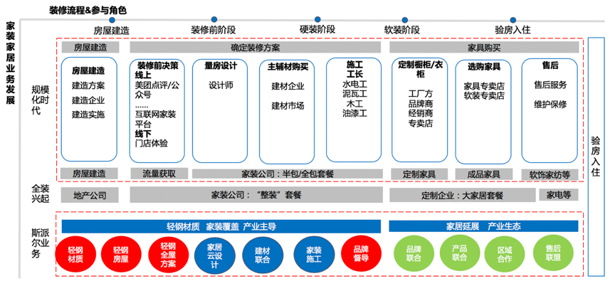 縱觀國內輕鋼產業經營尚處于“粗放經營階段”,輕鋼品類教育尚在進行中,區域用戶教育尚需時日,各家輕鋼企業在標榜“家居產業鏈經營”的同時,大多專注在“前端輕鋼房屋建造+前端用戶開發+粗放式代理管控”,優秀品牌作為輕鋼產業新進入者,想后來居上,就要高舉“輕鋼家居生活”的消費旗幟,高舉“輕鋼產業鏈經營”的商業大旗,立足輕鋼建筑做經營,融入墻板業務做亮點,煥發輕鋼品類消費特性,前期重輕鋼建筑和輕鋼家裝,中后期強化輕鋼家居生活。