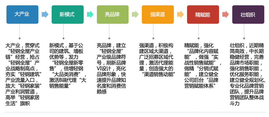 “六步致勝”之一:大產業,貫穿式“輕鋼全屋產業鏈”經營,搶占“輕鋼全屋”產業戰略制高點,夯實“輕鋼建筑”產業流量入口,放大“輕鋼家裝”產業利潤管道,高舉“輕鋼家居生活”旗幟