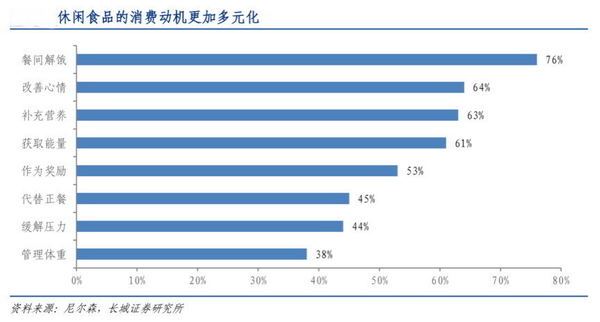 休閑食品經(jīng)過(guò)多年發(fā)展,消費(fèi)場(chǎng)景已經(jīng)大大增加,從原有傳統(tǒng)的充饑解餓、獲取能量向更多的品質(zhì)、享受及壓力緩解等發(fā)展,“泛休閑”的消費(fèi)場(chǎng)景打造已經(jīng)成為各休閑食品品牌營(yíng)銷策劃的主要驅(qū)動(dòng)力。根據(jù)尼爾森、長(zhǎng)城證券研究所等綜合資訊表明,休閑食品的消費(fèi)動(dòng)機(jī)更加多元化,3/4 以上的全球消費(fèi)者吃零食是為了在兩餐之間消除饑餓感,63%是為了補(bǔ)充營(yíng)養(yǎng),45%的人們會(huì)代替正餐,還有相當(dāng)一部分人為了緩解壓力、管理體重,消費(fèi)群體也從兒童、老人等擴(kuò)大到購(gòu)買力更強(qiáng)的年輕白領(lǐng),休閑食品的消費(fèi)日益多元化。