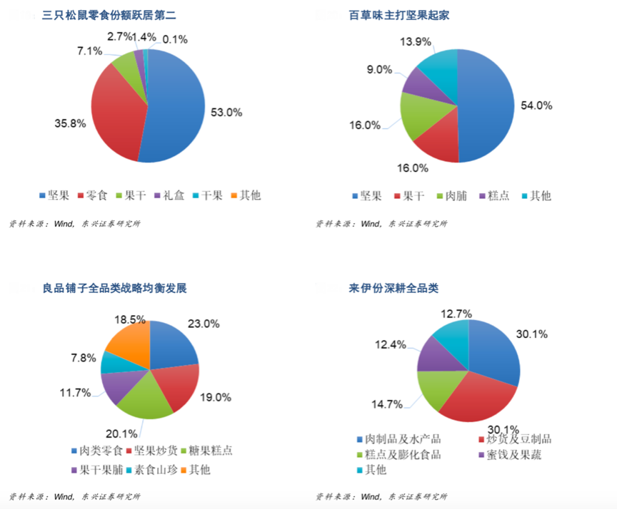 經(jīng)典案例:根據(jù)wind、東興證券研究所等綜合資訊表明,三只松鼠自 2012 年主打堅(jiān)果起家,隨即引爆休閑食品電商平臺(tái),2014 年其拓展業(yè)務(wù)至干果、花茶等周邊產(chǎn)品。百草味亦主打堅(jiān)果起家,2013 年堅(jiān)果收入占比72.47%,至 2017 年已降至 54%,果干/肉脯/糕點(diǎn)分占 16%/16%/9%。良品鋪?zhàn)邮冀K主打全品類戰(zhàn)略,布局更為廣泛均衡,SKU 逾 1200 種。