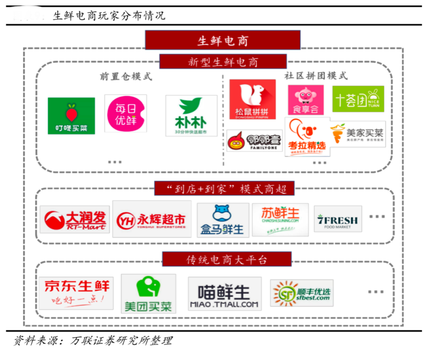 國內生鮮新零售業(yè)務的推進主體相對集中,主要是生鮮電商和線下農產品企業(yè)、商場超市等。生鮮電商以生鮮產品線上交易為主,側重在線交易、配送到家、社群互動等,“到家模式”、“社區(qū)拼團模式”等是其典型代表;而線下農產品企業(yè)多依托于線下門店,為附近的居民提供線上下單、門店配送到家的一體化生鮮交易服務,這也是國內比較流行的模式,商超更創(chuàng)新了“到店交易+門店配送到家”等多樣化新零售運營模式。