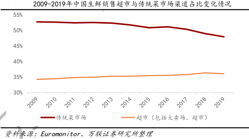 生鮮業(yè)務全渠道構建是大勢所趨。自“農改超”模式在全國迅速推進后,超市企業(yè)紛紛布局生鮮品類業(yè)務。根據Euromonitor的數據顯示,2019年,中國生鮮 銷售市場中,傳統(tǒng)農貿市場渠道的占比為47.90%,較2009年的52.70%下滑了4.8pct, 超市渠道2019年占比為36.00%,較2009年的34.20%提升了1.8個pct。