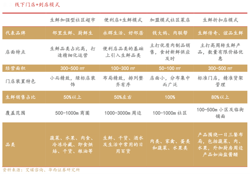 根據艾媒咨詢、華西證券研究所等綜合資訊表明,到家模式、社區團購模式、線下門店+到店模式等生鮮電商新零售模式風行國內,尤其是“線下門店+到店”模式,該模式下的四種門店類型基本覆蓋社區、商圈100-3000m,貼近社區增加消費便利性,生鮮銷售占比基本在 50% 以上,基本圍繞家庭高頻消費的蔬菜、水果、肉蛋類商品為主,門店裝飾和布局一般較為精致,提升消費體驗,引領生鮮行業創新風尚。