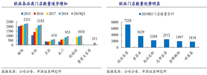經典案例:根據公司公告、開源證券研究所等綜合資訊表明,截至2019Q3,歐派共有門店合計 7335 家(包括整裝大家居251家);分品類看,廚柜門店數量明顯占優,衣柜差距縮小。歐派廚柜在經銷商和門店 數量依然擁有較大領先優勢,衣柜門店規模逐漸接近索菲亞。其他品類中,衛浴、木門和歐鉑麗開店的頻率仍然較高;整裝大家居已經初具規模。